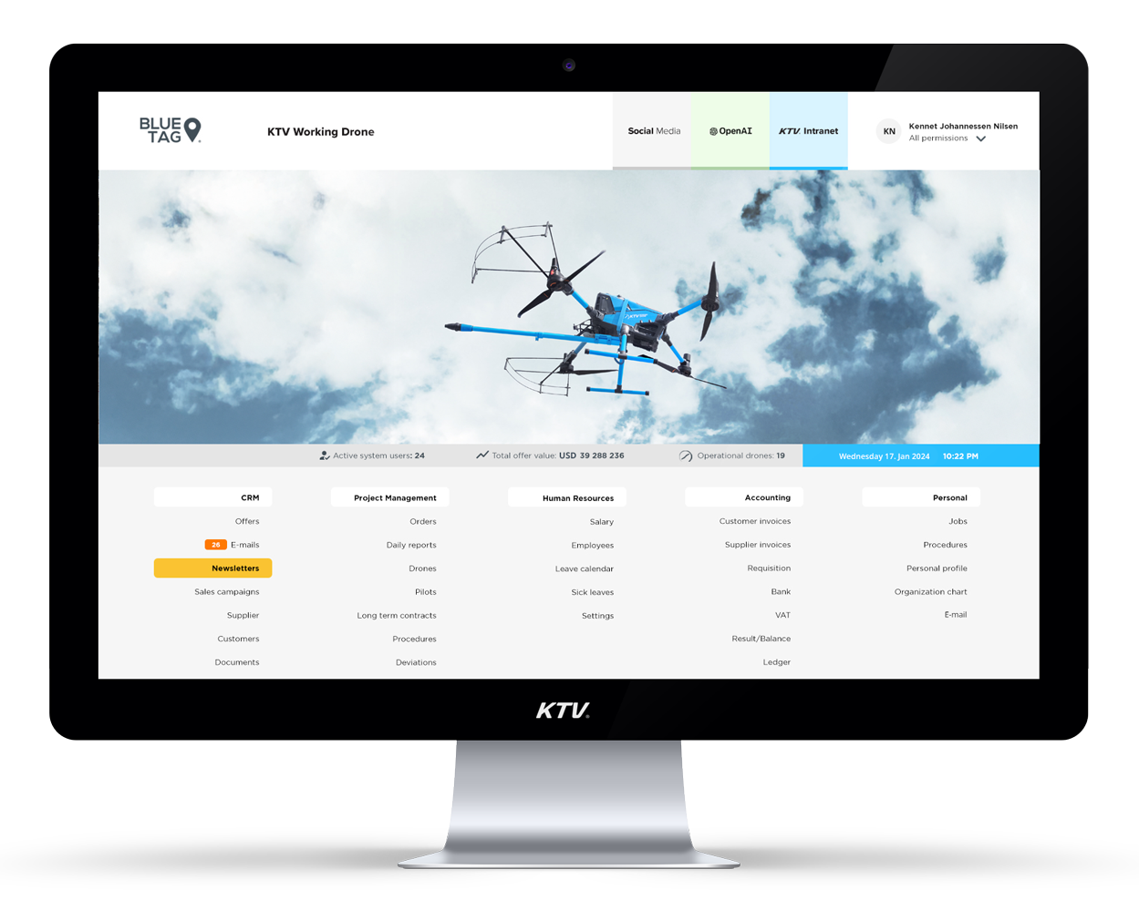 KTV BlueTag Admin is a complete CRM system built to support ISO 9001, 45001, and 14001 standards. It manages pilots, jobs, reports, deviations, and procedures. Customer links can be shared to show documentation. Partners gain full operational control.