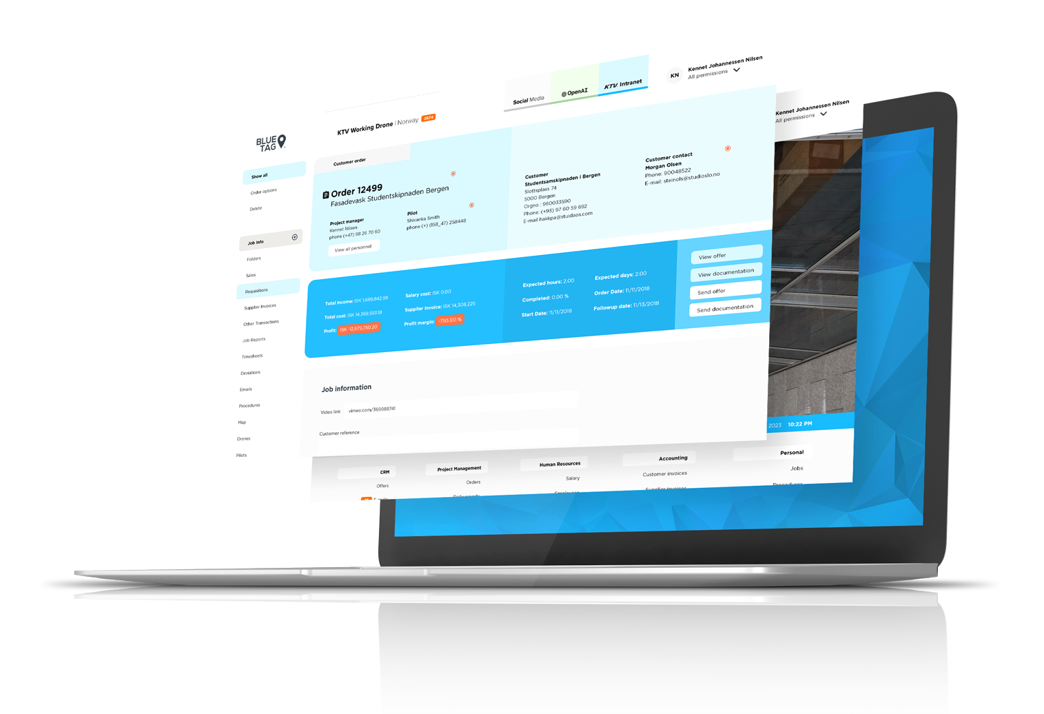 KTV BlueTag Admin is a complete CRM system built to support ISO 9001, 45001, and 14001 standards. It manages pilots, jobs, reports, deviations, and procedures. Customer links can be shared to show documentation. Partners gain full operational control.